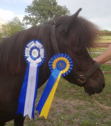 Jag har alltid velat haft en ponny från Stuteri Emmero. När jag var där och skulle välja ut ett sto så blev det Olympia. Hon hade en väldigt bra stam och stod en liten bit ifrån och tog det lite försiktigt. Hemma efter några år har hon nu utecklats till ledaren i gänget, Hon är alltid först fram och hälsar, nyfiken och undersöker vad som sker. Hon gillar fart och fläkt, det ska gå fort framåt! När de andra galopperar, länger hon bara stegen och fortsätter att trava framåt!
